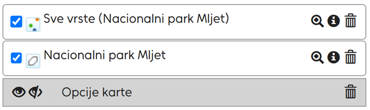 moguće je prikazati ili sakriti sve slojeve karte. - Odabirom ikona za brisanje slojeva