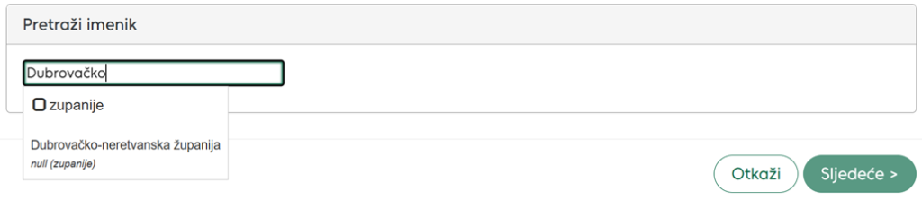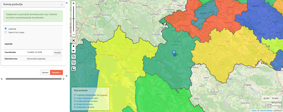Gazetteer poligon – Opcija omogućuje pretraživanje poligona unutar postojećih kontekstualnih slojeva (više informacija u poglavlju Unos okolišnih i kontekstualnih slojeva). Prostorni obuhvat je definiran odabranim poligonom. Područje se sprema se u obliku sloja te je njime moguće upravljati kako je opisano u poglavlju Navigacija unutar Prostornog portala.