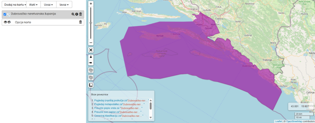 Nacrtaj poligon – Opcija omogućuje crtanje proizvoljnog oblika na karti te se koristi prilikom precizne analize područja nepravilnih granica. Klikom na kartu crtaju se točke koje čine granicu poligona. Poligon se zatvara ponovnim klikom posljednje točke ili klikom na početnu točku. U bočnom izborniku moguće je upisati ime prostornog obuhvata te se generira WKT područja. Izrađeno područje sprema se u obliku sloja te je njime moguće upravljati kako je opisano u poglavlju Navigacija unutar Prostornog portala.