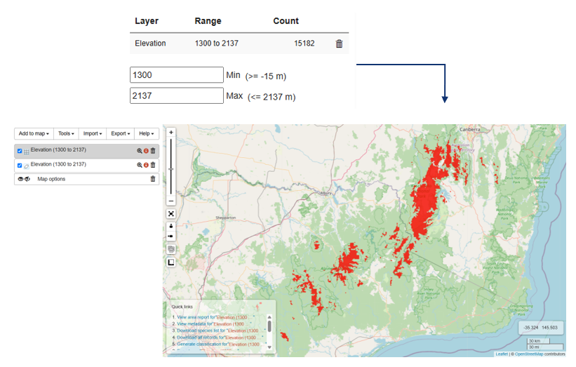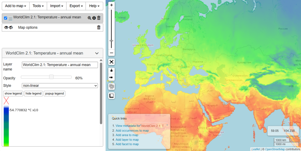 Dodavanje okolišnih i kontekstualnih slojeva na kartu, zajedno s njihovim atributima, moguće je odabirom Dodaj na kartu, a zatim Slojevi. Okolišni slojevi sadrže kontinuirane brojčane vrijednosti okolišnih parametara, kao što su temperatura i nadmorska visina (prikazano na slici ispod).
