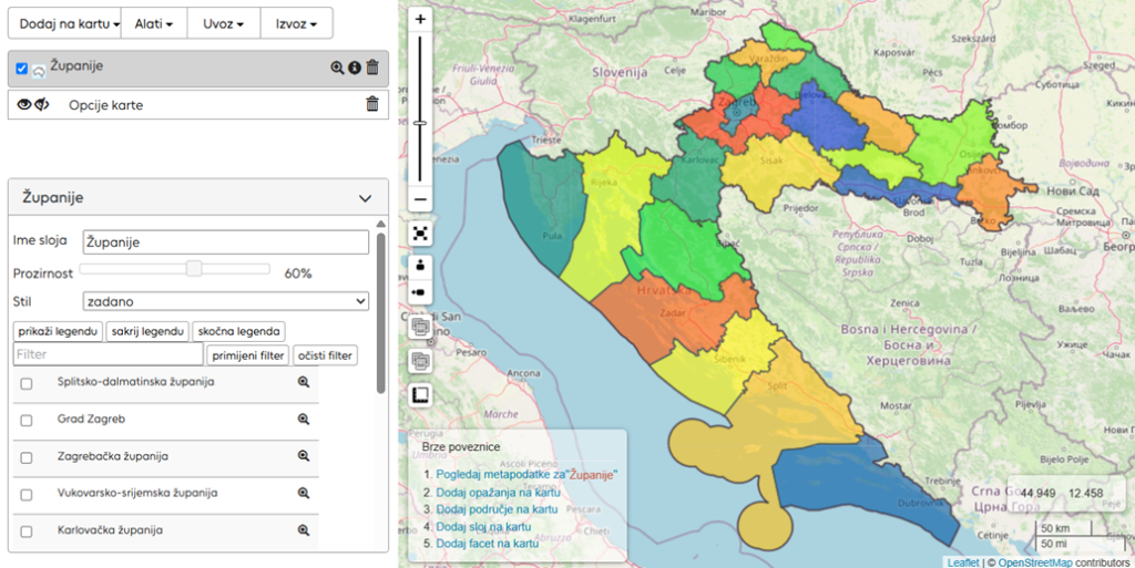 Unutar bočnog izbornika s lijeve strane sučelja, vidljive su akcije koje je moguće izvršiti nad kartom (više informacija u poglavljima Unos podataka na kartu Prostornog portala, Analiza podataka unutar Prostornog portala, Izvoz podataka iz Prostornog portala) te slojevi karte. Slojevi karte predstavljaju zasebne skupove podataka koji se vizualiziraju i preklapaju na karti. Osnovni sloj se otvara sa svakom novom sesijom te služi za upravljanje svim drugim slojevima.